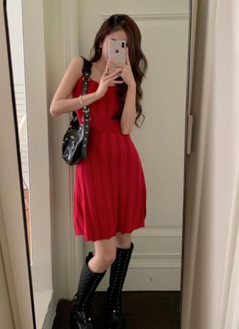 2023春夏新作 女 レディース ハイウエスト 袖なし ニット ミニ ワンピース ドレス 台型スカート