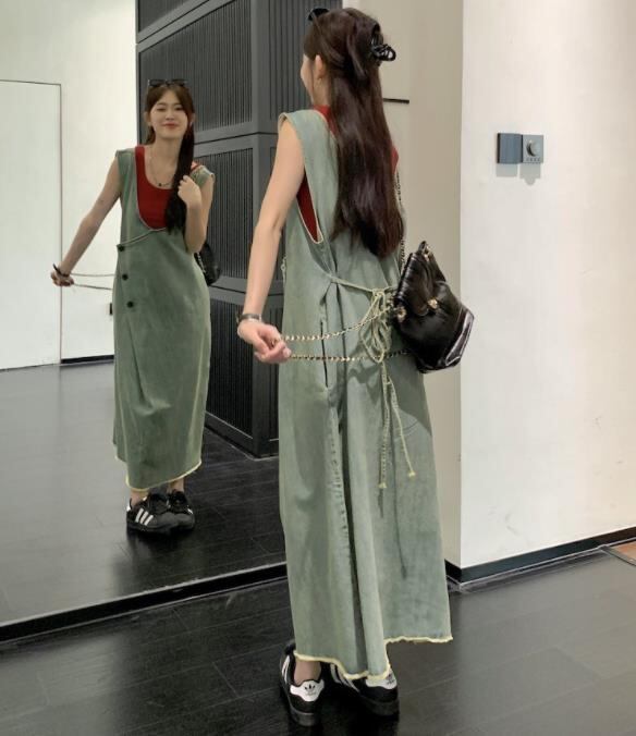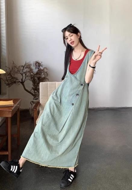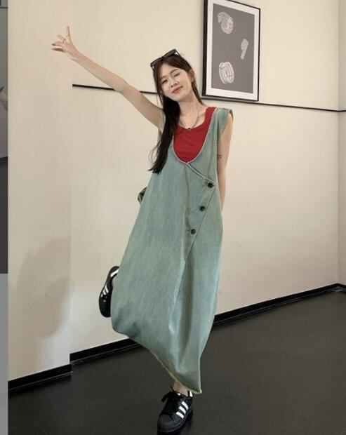 春夏新作 女 レディース 袖なし デニム サロペットスカート ロング ワンピース 台型スカート セット