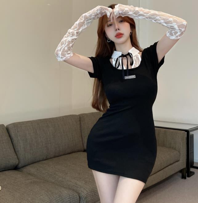 春夏新作 女 レディース ハイウエスト 半袖 手袋付け ミニ ワンピース ドレス タイトスカート S-XL