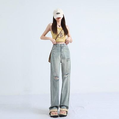 ダメージジーンズ レディース ハイウェスト ワイドパンツ 春夏 着痩せ スト レート モップパンツ