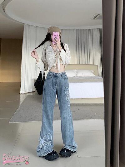 ハイウエスト フリンジ デニムパンツ ボトムス レッグ ゆるダボ ジーンズ ゆったり カジュアル ストリート 切りっぱなしカットオフ 加工 肌見せ ジーパン ファッション 秋 冬 春 スタイルアップ