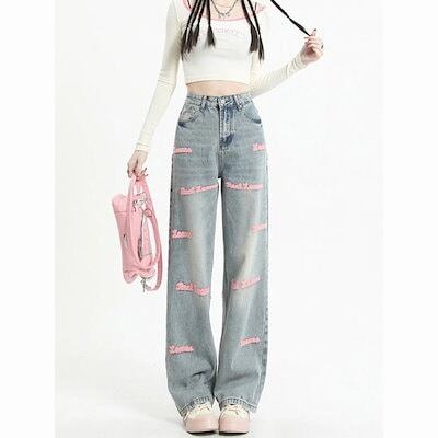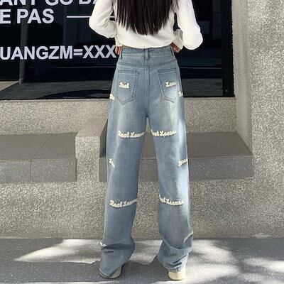 【3日以内出荷】脚長効果!デニムパンツ ヴィンテージ ワイドパンツ ハイウエスト レディース 刺繍 ストレートレッグ・パンツ ルーズ ワイドパンツ 韓国ファッション