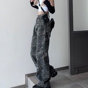 【3日以内出荷】脚長効果!デニムパンツ カモフラージュ 作業着ズボン レディース ルーズ ハイウエスト ワイドパンツ 薄い 長ズボン 韓国ファッション