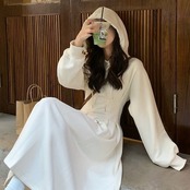 フレア 可愛い エレガント お出かけ 春 こなれ感 大人可愛い 韓国 ベーシック シンプル 長袖ワンピース 白 黒 ボリュームスカート 華奢見え 体型カバー 細見え ウエストシェイプ | coolcoool