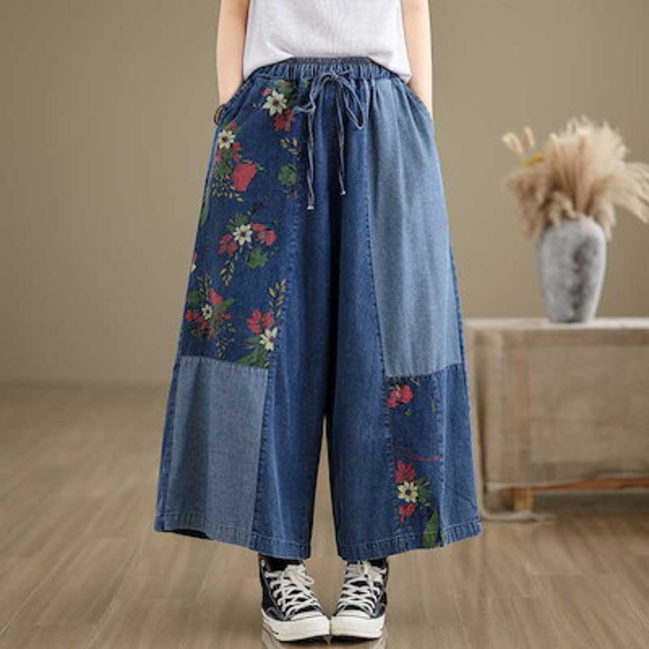 「ファットガール」 夏 デニム ワイドパンツ 刺繍 レトロ 薄手 ドッキング ワイドパンツ 体型カバー 大きいサイズ ゆったり レディース