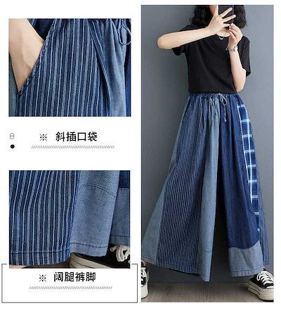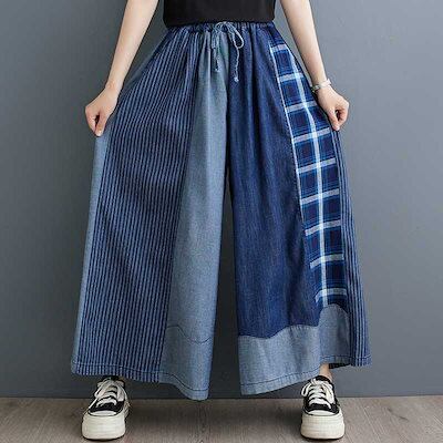 「ファットガール」 2024夏新品 レトロ デニム ドッキング ワイドパンツ フレア 大きいサイズ 巾着 ゴム 体型カバー レディース キュロットスカート ロングパンツ メガ割 | coolcoool