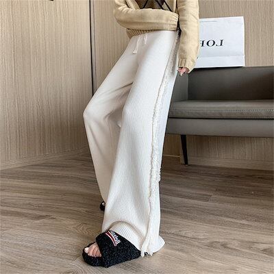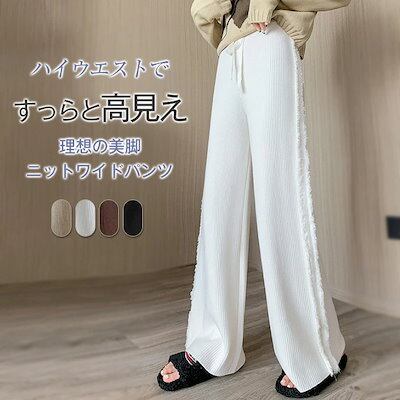 パンツ レディース リブニット きれいめ ニット ストレッチ 秋 冬 ワイドパンツ 暖か ストレート ウエストゴム リブ イージーワイドパンツ ボトムス 楽ちん 厚手 ゆったり ロング 大きいサイズ | coolcoool