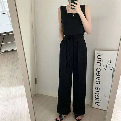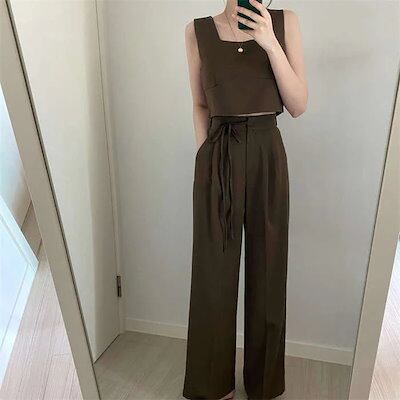 セットアップ レディース 2点セット 夏 春 無地 パンツスーツ 上下セット トップス ワイドパンツ ベスト ジレ ノースリーブ ショート丈 タンクトップ スクエアネック 着痩せ シンプル きれいめ | coolcoool