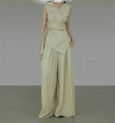 セットアップ リネン レディース パンツスーツ 上下セット 春夏 ベスト ジレ ノースリーブ ガチョウパンツ スカーチョ スカンツ パンツ ワイド ハイウエスト ポケット付き ロング パンツドレス ゆ | coolcoool
