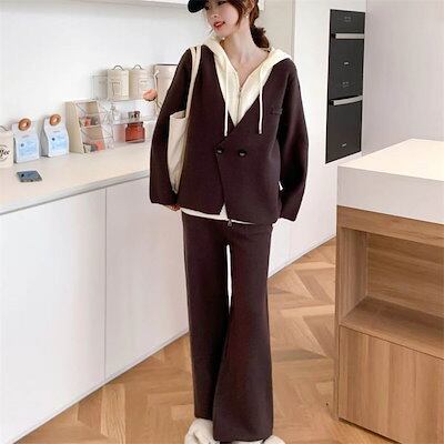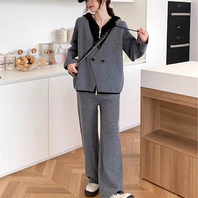 ニットセットアップ レディース パンツスーツ レイヤード風 2点セット フェイクレイヤード 春 秋冬 ニット 2点セット パンツ コート ロング丈パンツ パーカー 長袖 秋 冬 ワイドパンツ ゆったり | coolcoool