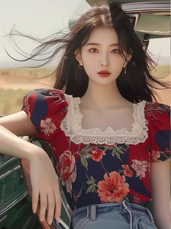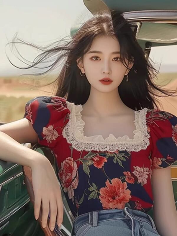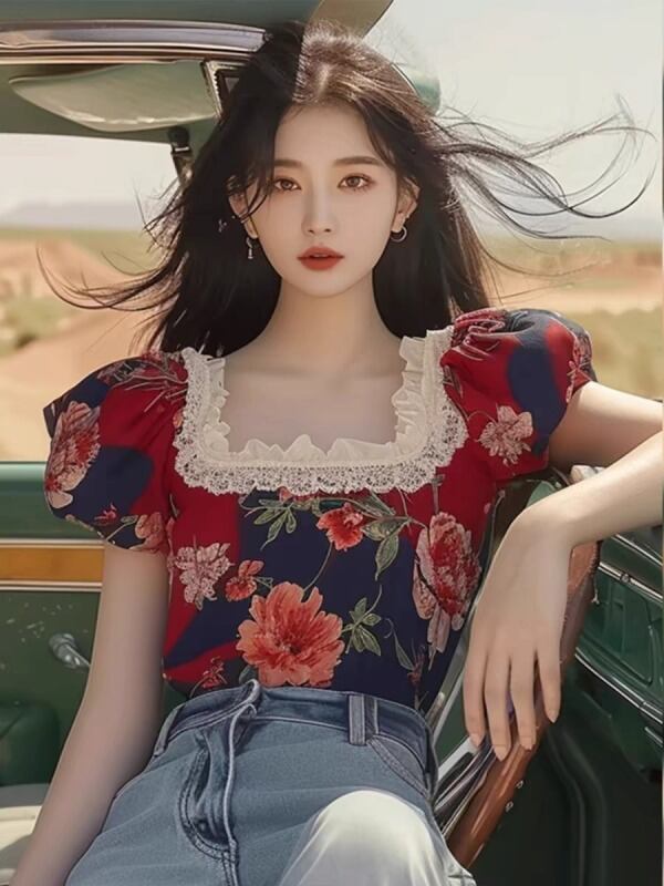 半袖トップス ボリューム袖 切り替え バイカラー 体型カバー 着痩せ レース sweet系