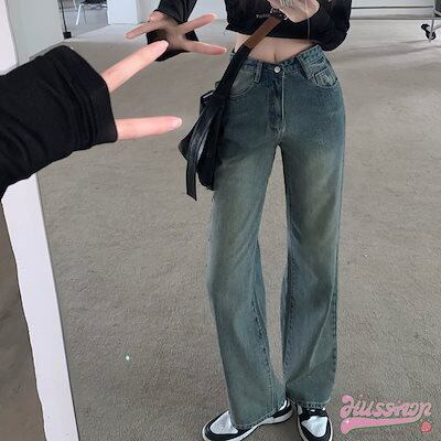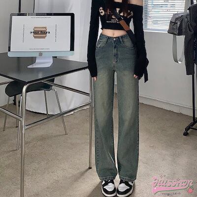 ハイウエストストレートジーンズ レディース ストレートロングパンツ カジュアル 可愛い シンプル