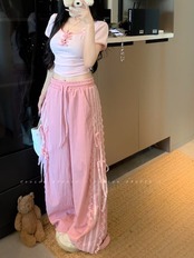 2024秋冬 パンツロング丈ストレートストライプウエストゴムワイドハイウエストゆったり 脚長効果美脚効果細見え春カジュアル黒白韓国系ファッションレディースサイドお出かけおしゃれ かわいい衣装トラック | coolcoool