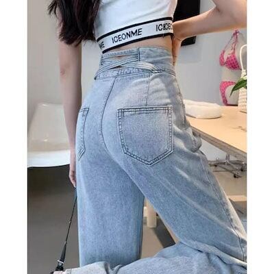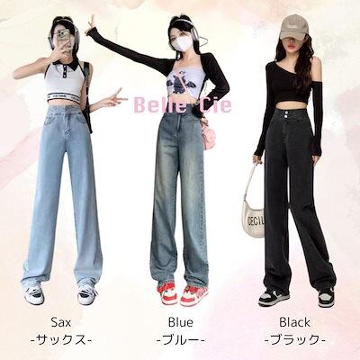 デニムパンツ デニム ワイドパンツ ストレート バッククロス ロングパンツ レディース 韓国ファッション 黒 サックス シンプル ハイウエスト 美脚 かわいい