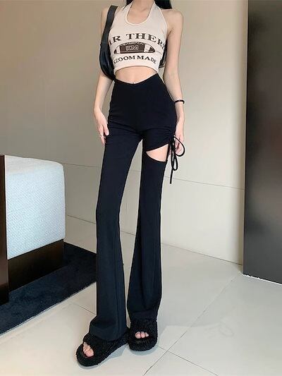 2024 秋冬 パンツ モップパンツ ロングパンツ ワイド ハイウエスト 脚長効果 美脚効果 細身 細見え 夏春 カジュアルフィット かわいい 韓国系ファッションサイド 加工レディース お出かけ | coolcoool