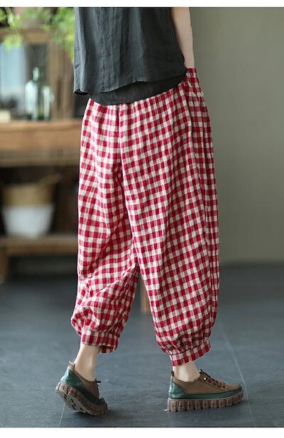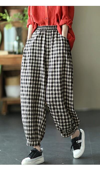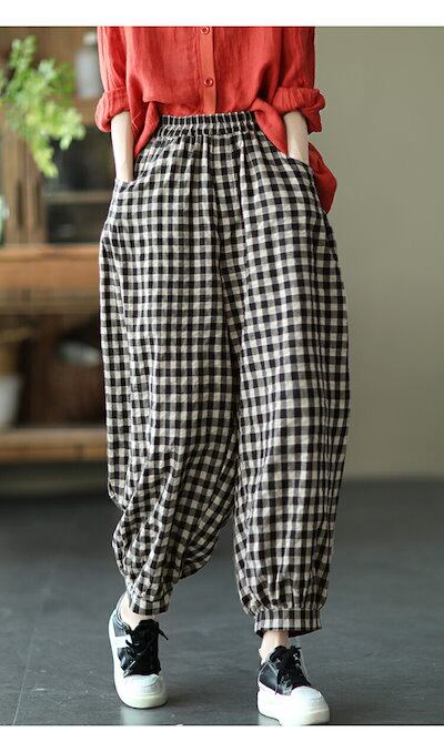 バルーンパンツ 綿麻風パンツ サルエルパンツ レディース パンツ ボトムス リネン ワイドパンツ 9分丈 チェック柄 夏服 春夏 ロング丈 美脚 丸み おしゃれ 着やせ リラックス ゆったり ウエスト | coolcoool