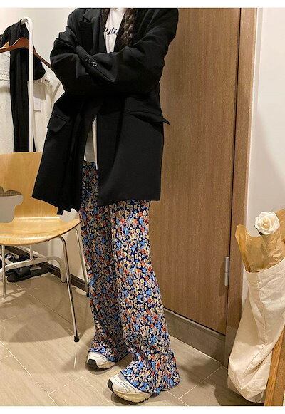 2色 花柄 パンツ レディース ストレートパンツ ワイドパンツ 春 夏 薄手 小花柄 かわいい 大人可愛い 個性的 ラフ ルームウェア 部屋着 ズボン ボトムス こなれ感 フラワー 韓国 黒 白 2X | coolcoool