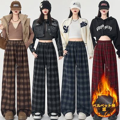 パッド入りベルベットツイードチェック柄パンツ レディース 秋冬 レトロ ストレート カジュアル ゆったり 薄手 ワイドパンツ
