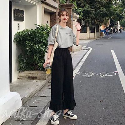 ロングパンツ ガウチョパンツ レディース 女性 ボトムス 長ズボン ウエストゴム 裾フリル 可愛い ワイドパンツ ペチパンツ クロップド丈 ハイウエスト 薄手 スウェットパンツ カジュアル 夏 大人か | coolcoool