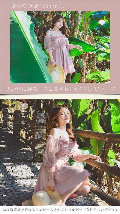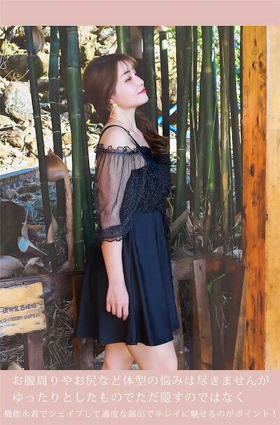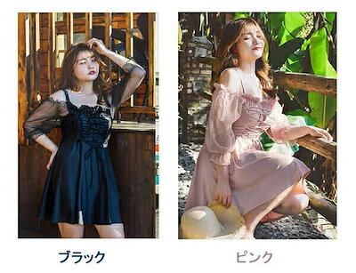 水着 レディース 体型カバー 黒 ピンク ワンピース 大きいサイズ 3L 4L 5L 6L 7L オフショルダー かわいい ブラック シースルー 袖透け感あり 二の腕カバー お尻カバー お腹カバー | coolcoool