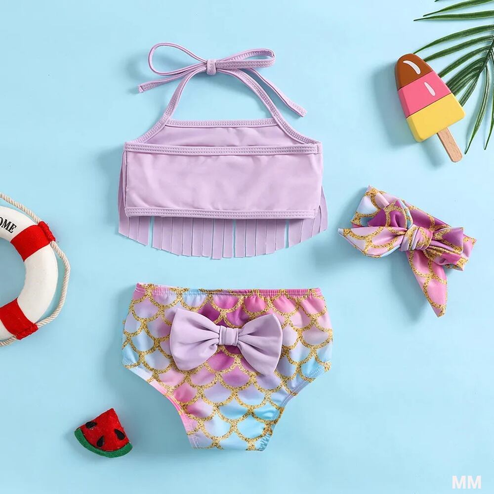 女の子のための弓とヘッドバンド付きの人魚の水着、2ピースセット、ビーチビキニ、チェストフリンジデザイン、温泉 韓国系水着 セパレート水着 ワンピース水着 T240626154127_01 | coolcoool