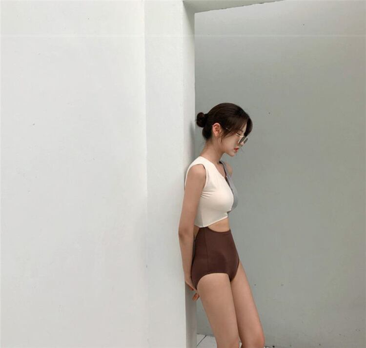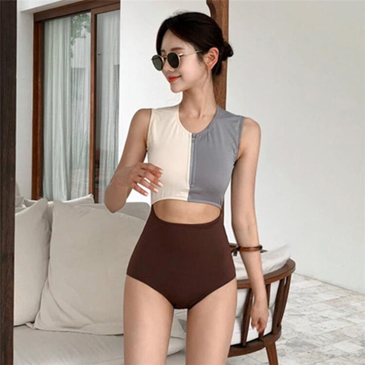 韓国ファッション 小さな香りの風 カラーマッチング ジッパー 透かし彫り ンビネゾン 温泉 水着 女性 簡約