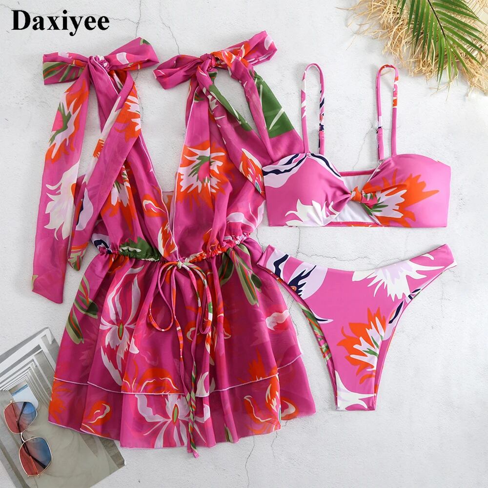 女性用ワンピースフローラルプリント水着、3ピースビキニセット、カバーアップ、ディープVネックメッシュワンピース、水着、フロントノットひも、水着 ワンピース水着 T240617130053_01 | coolcoool