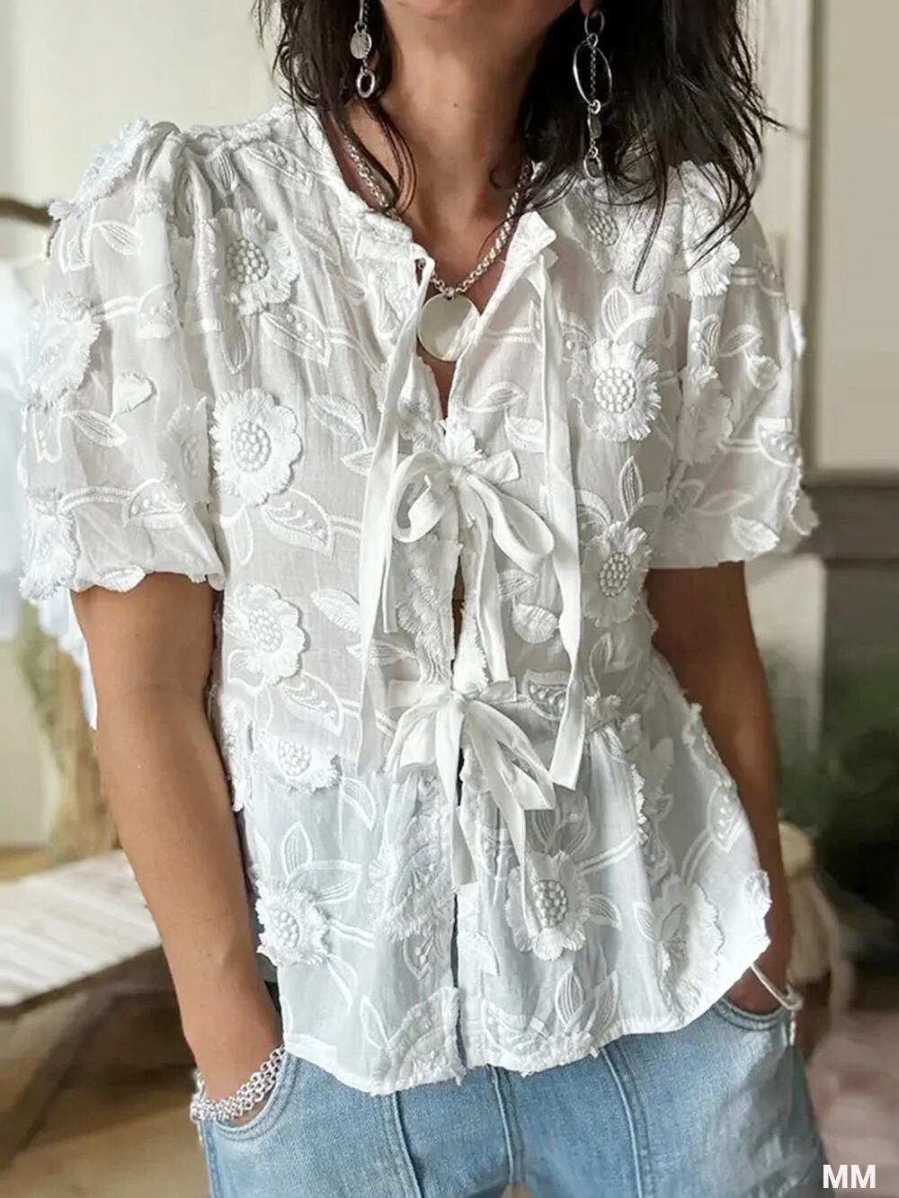 女性のための白い花の刺繍レースアップシャツ、半袖、ルーズボウ、パフスリーブ、シックな女性のブラウス、ストリートウェア、エレガント Tシャツ シャツ T240619142328_01 | coolcoool