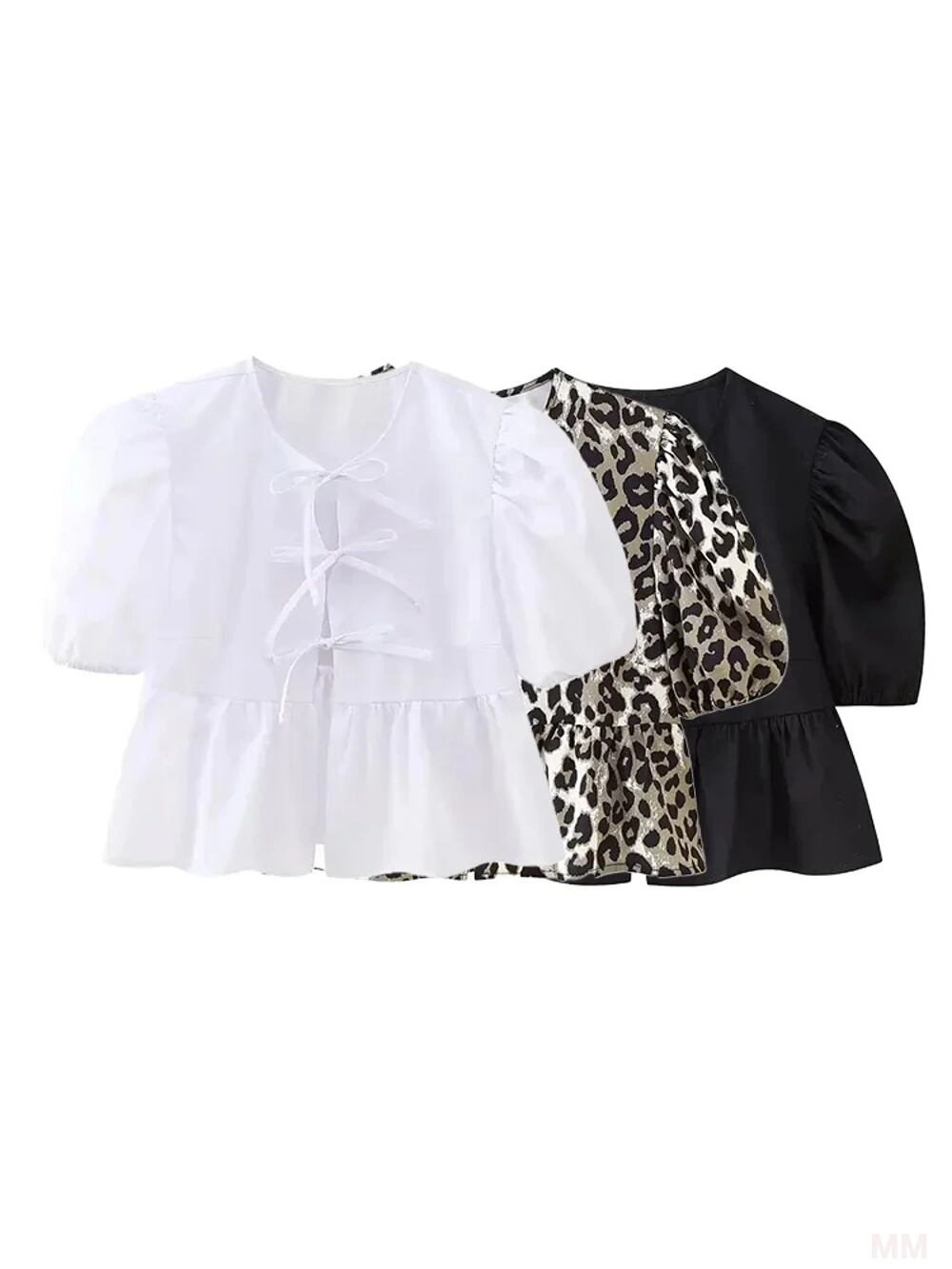 Hh traf 女性のカジュアルなパフ半袖ブラウス、Oネックフリルトップス、レースアップシャツ、弓、単色、エレガントなファッション、夏 Tシャツ シャツ T240619142416_15 | coolcoool