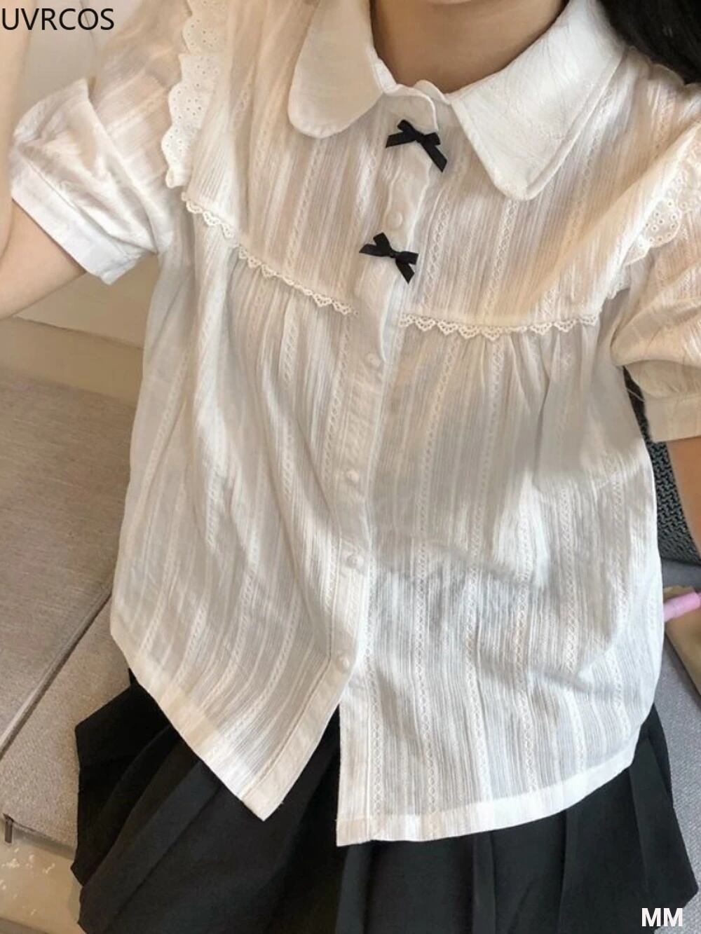 かわいい白ロリータレースブラウス女性ゴシックプレッピースタイルヴィンテージピーターパン襟半袖シャツ夏かわいいトップmujer Tシャツ シャツ T240619142448_01 | coolcoool