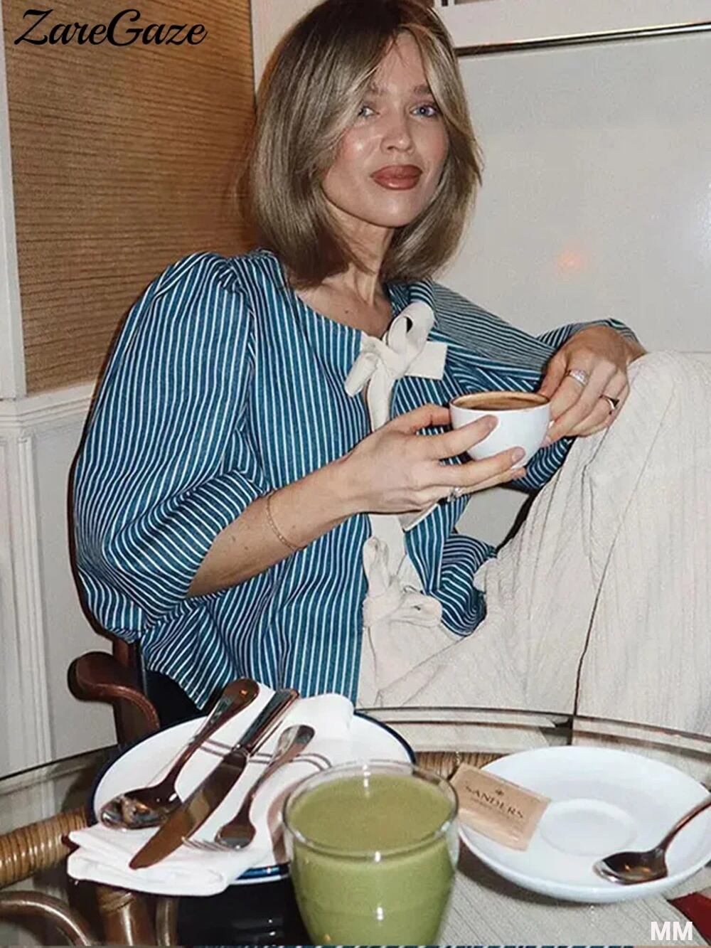 女性用半袖ストライプシャツ、レースアップボーパフスリーブ、ラウンドネックルーズトップス、レディースカジュアルジョーカー服、女性のファッション、夏、2024 Tシャツ シャツ T240619142707_01 | coolcoool