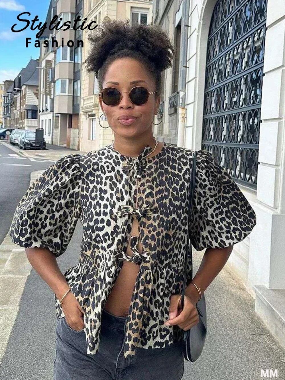 女性用ヒョウ柄Tシャツ,レースアップ,ラウンドネック,半袖,ショートパフ,女性用Tシャツ,サマーファッション,オールマッチ,ストリート,2024 Tシャツ シャツ T240619142804_04 | coolcoool