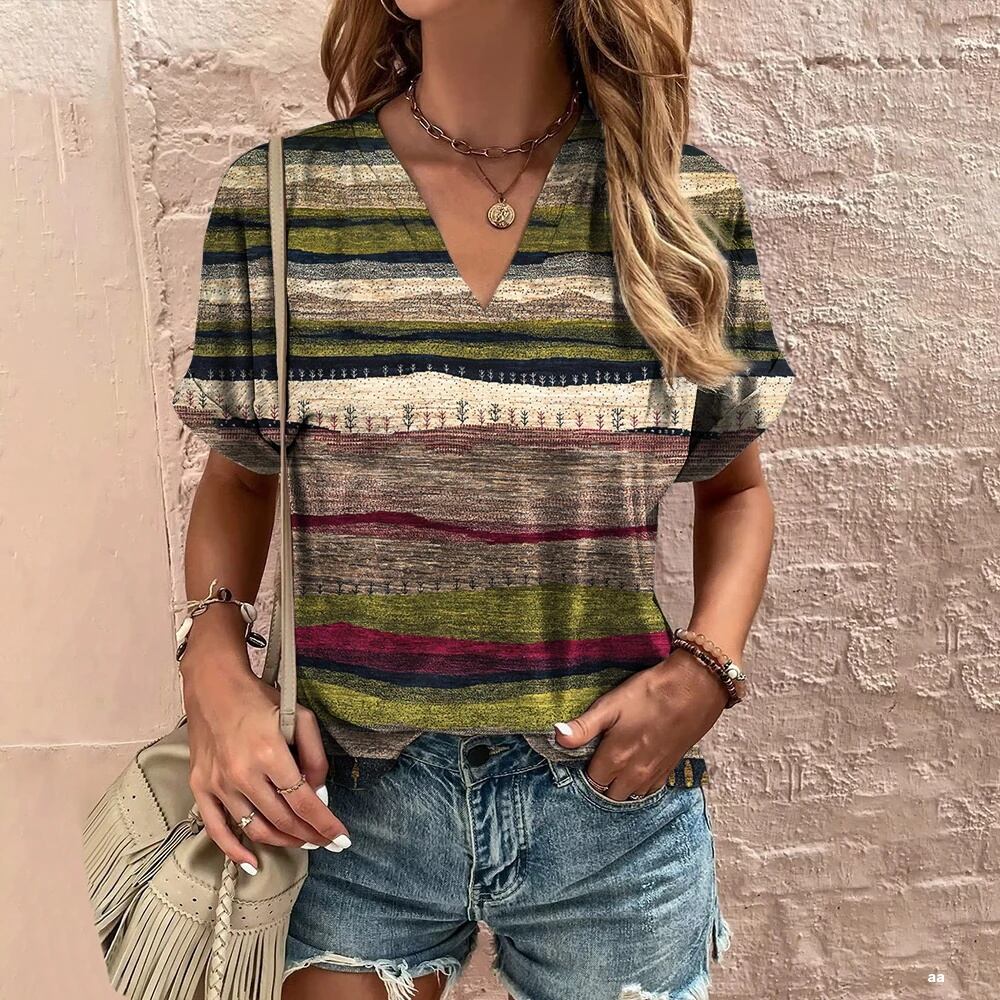 女性用Vネック半袖Tシャツ,レトロなカジュアルウェア,ストライププリント,ストリートウェア,夏のノベルティ ボトム ボトムス ズボン T240619193735_05