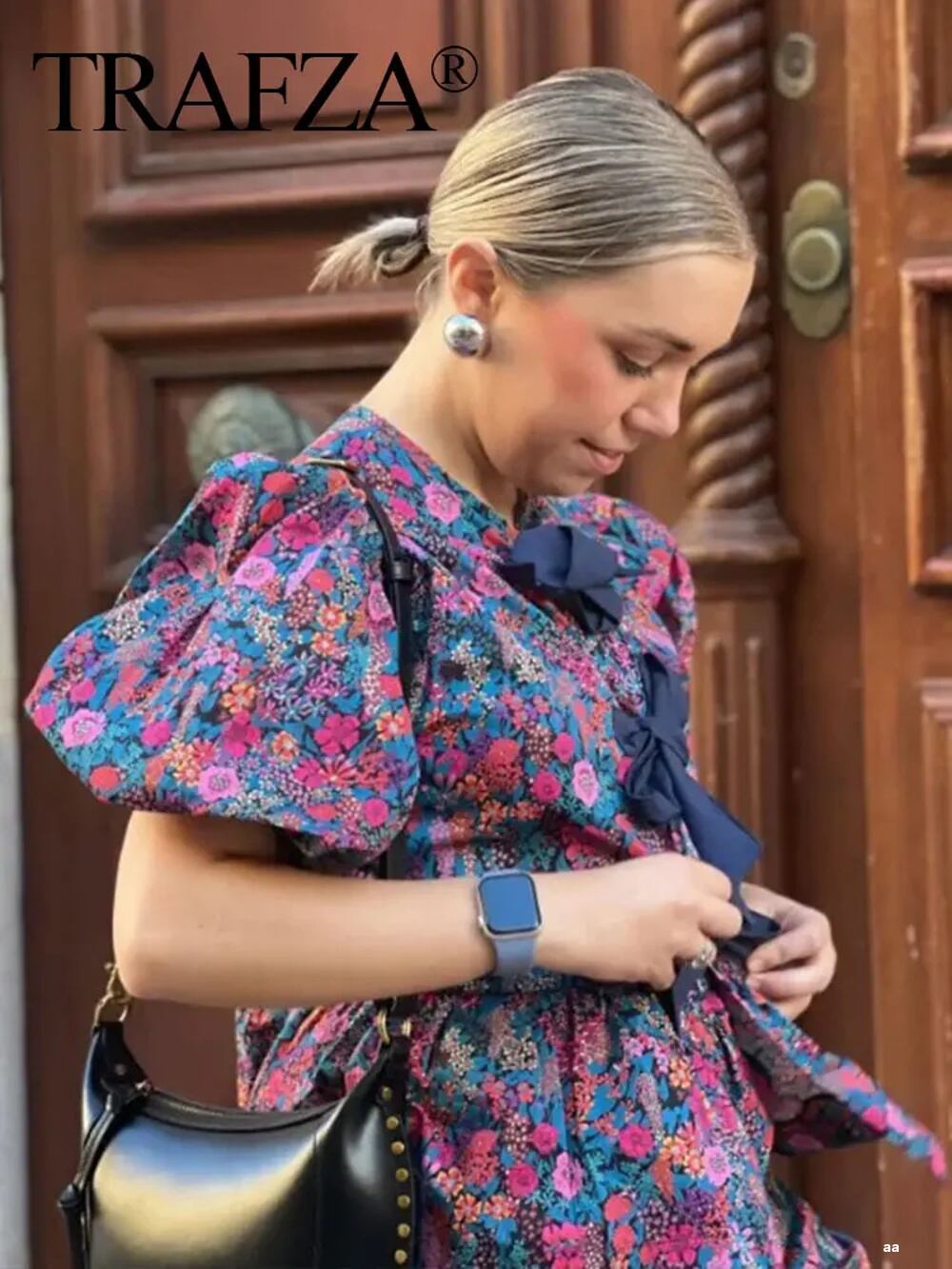 Trafza レディースフローラルプリントボウレースアップブラウス、oネック、半袖シャツ、ヴィンテージ、y2k、女性のシックなトップス、ストリートウェアシャツ、ファッション ボトム ボトムス ズボン T240619142408_02 | coolcoool