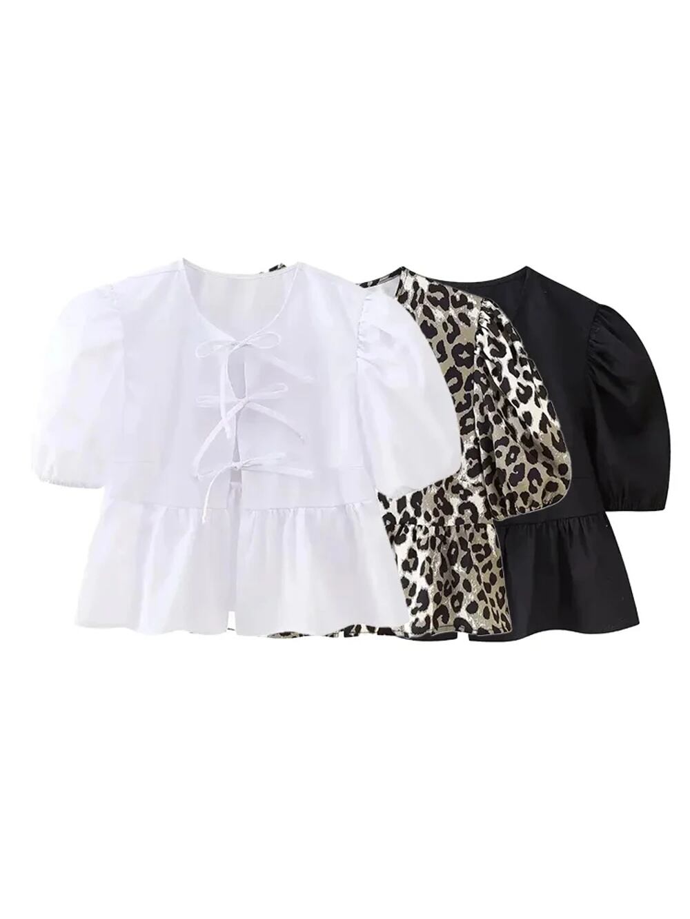 Hh traf 女性のカジュアルなパフ半袖ブラウス、Oネックフリルトップス、レースアップシャツ、弓、単色、エレガントなファッション、夏 ボトム ボトムス ズボン T240619142416_06 | coolcoool
