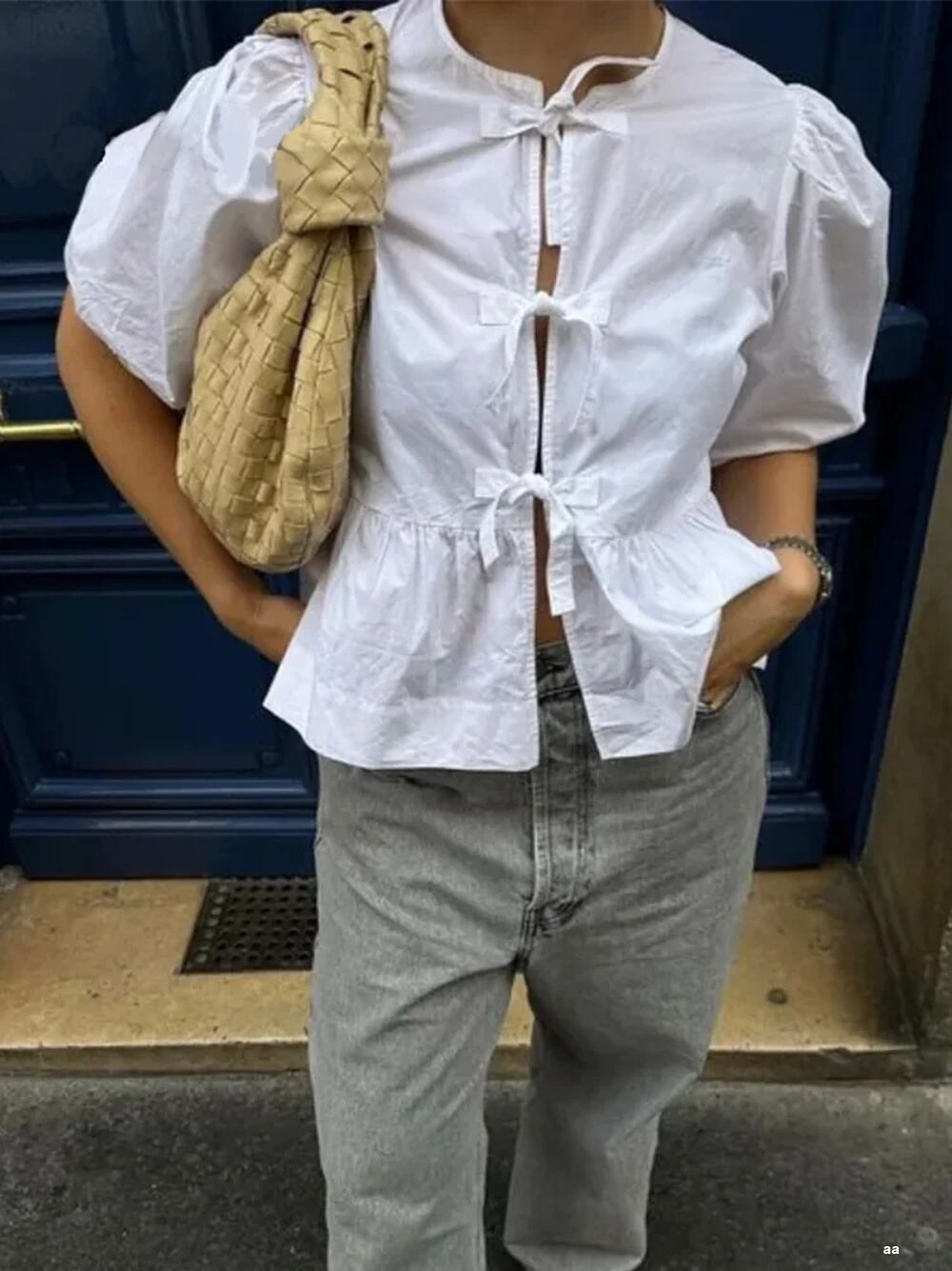 Hh traf 女性のカジュアルなパフ半袖ブラウス、Oネックフリルトップス、レースアップシャツ、弓、単色、エレガントなファッション、夏 ボトム ボトムス ズボン T240619142416_12 | coolcoool
