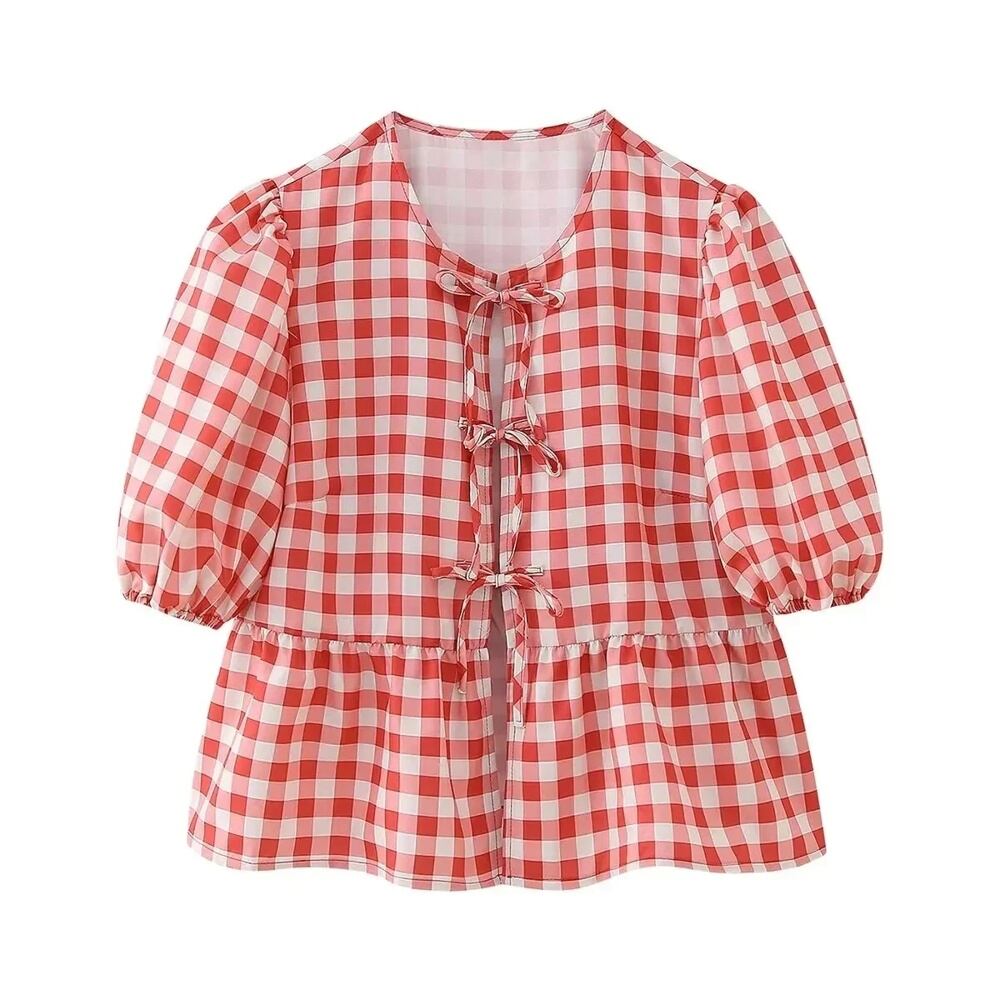 Hh traf 女性のカジュアルなパフ半袖ブラウス、Oネックフリルトップス、レースアップシャツ、弓、単色、エレガントなファッション、夏 ボトム ボトムス ズボン T240619142416_20 | coolcoool
