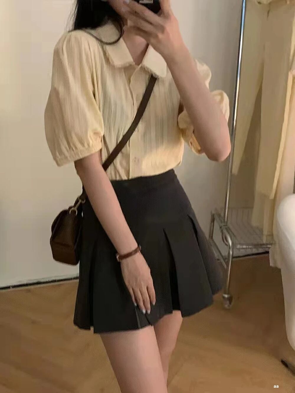 女性用半袖ブラウス、ペンタパンカラーシャツ、甘いルーズプレッピーイエローレース、女性用ジスターカジュアルブラウス、夏、韓国、2024 ボトム ボトムス ズボン T240619142538_01 | coolcoool