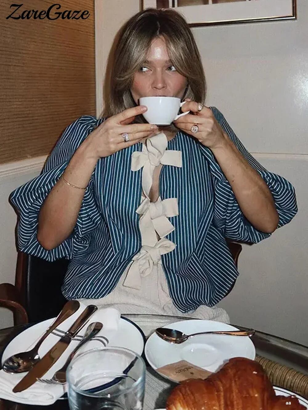 女性用半袖ストライプシャツ、レースアップボーパフスリーブ、ラウンドネックルーズトップス、レディースカジュアルジョーカー服、女性のファッション、夏、2024 ボトム ボトムス ズボン T240619142707_05 | coolcoool