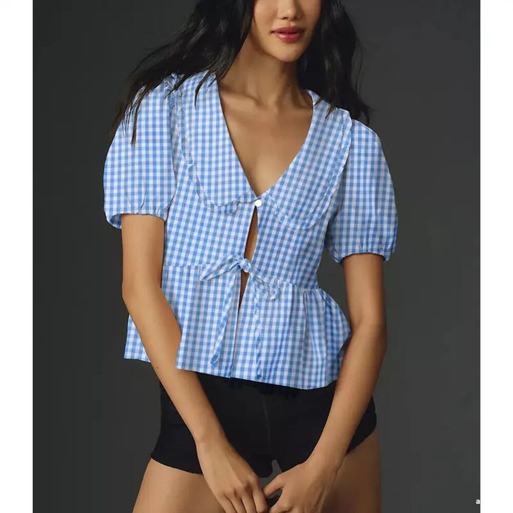 Xingqing 女性の市松模様の水玉模様のシャツ、エレガントな服、半袖カーディガン、ブラウス、クロップトップ、ストリートウェア、パレーターパンカラー、y2k ボトム ボトムス ズボン T240619142845_02 | coolcoool