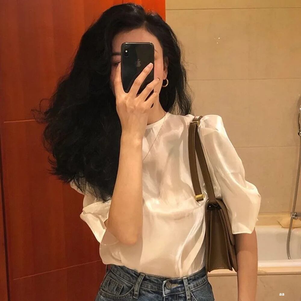 Deeptown 女性の白いパフスリーブサテンブラウス、韓国のファッション、半袖シャツ、夏のスリム、シック、エレガント、ベーシックレースアップ、古いお金 ボトム ボトムス ズボン T240619143012_01 | coolcoool