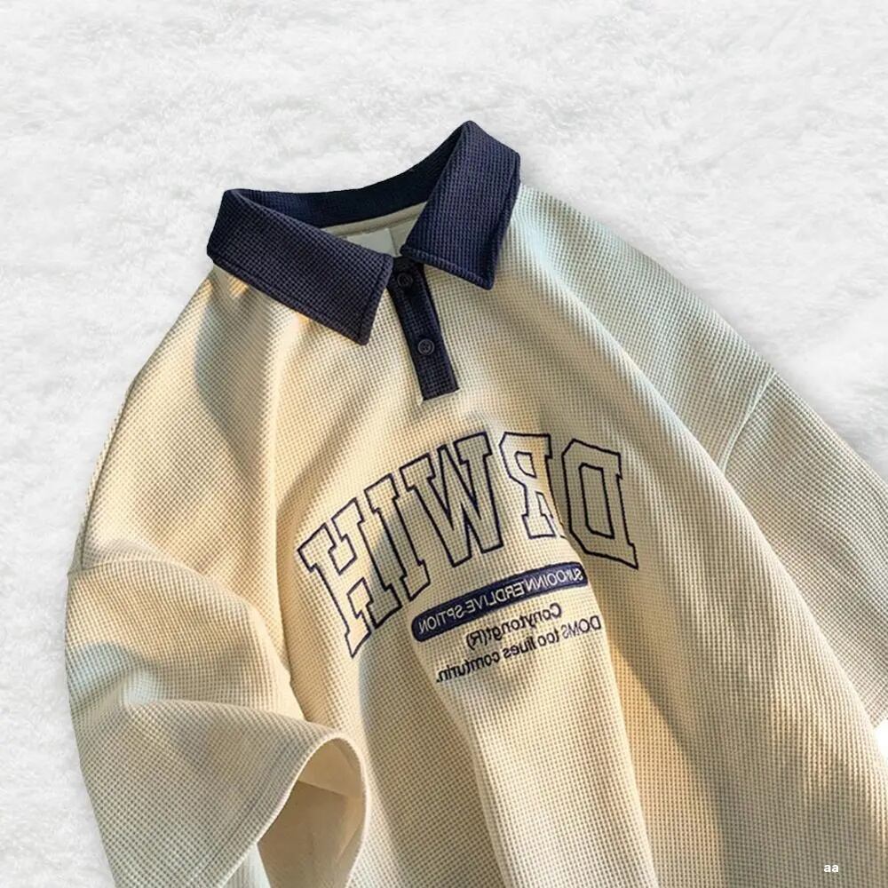 男性と女性のためのワッフル半袖ワッフルTシャツ、ルーズタイプ、折り返し襟、プレッピースタイル、学生トップス、夏 ボトム ボトムス ズボン T240619143029_03