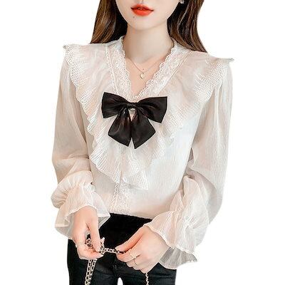 レディースシャツ 長袖 秋新作 森ガール風 蝶ネクタイのシャツ ゆとりがある パフスリーブトップス 百掛け やせて見える 韓国ファッション