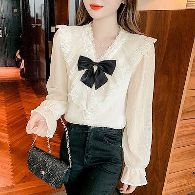 レディースシャツ 長袖 秋新作 森ガール風 蝶ネクタイのシャツ ゆとりがある パフスリーブトップス 百掛け やせて見える 韓国ファッション3