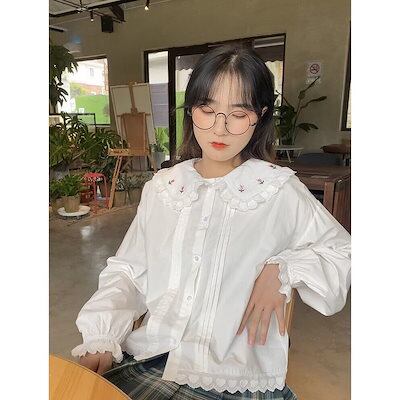 シャツ レディース 長袖百掛け 秋 ベビーカラー 小花の刺繍 白シャツ ゆとりがある 韓国ファッション2