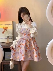 ワンピース 百掛け バブルスリーブ 白い長袖シャツ ポンポンスカート やせて見える ストラップワンピース 韓国ファッション