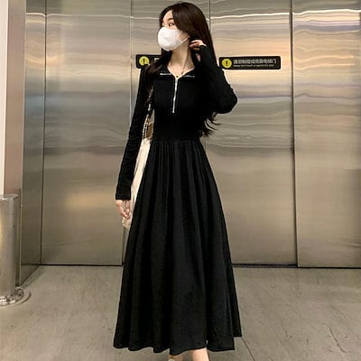 ワンピース 百掛け ブラック 長袖ワンピース 秋 やせて見える ミディアムスカート 韓国ファッション