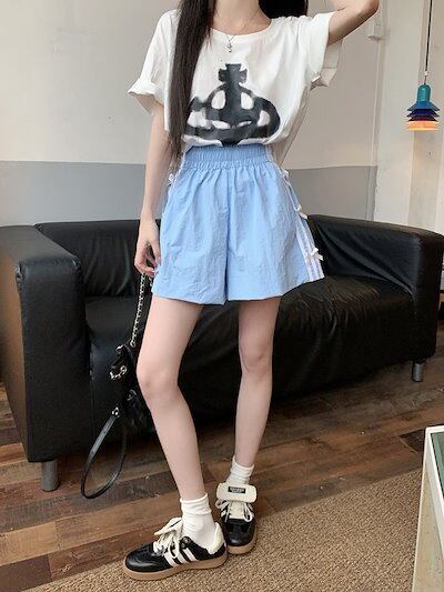 2024 春夏パンツ ショート丈 ワイド ウエストゴム ハイウエスト 美脚効果 脚長効果 細見え 短パン 黒白 おしゃれ かわいい 韓国ファッション系 レディース サイドお出かけ | coolcoool