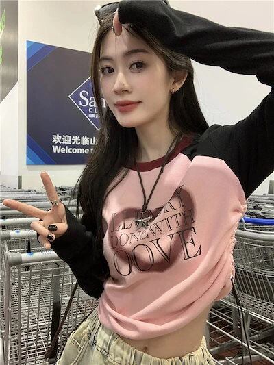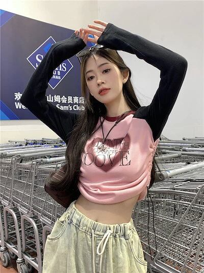 2024春夏 Tシャツ ショート カットソー 長袖 トップス カジュアル 配色 韓国ストリート タイト スリーブ 肌見せ T ファッション かわいいトップス