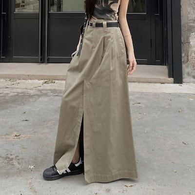 2024 春夏スカート ロング丈 Aライン スリット フロントオープン ハイウエスト 美脚効果 脚長効果 細見え 夏 カーキ おしゃれ かわいい 韓国ファッション レディース お出かけ